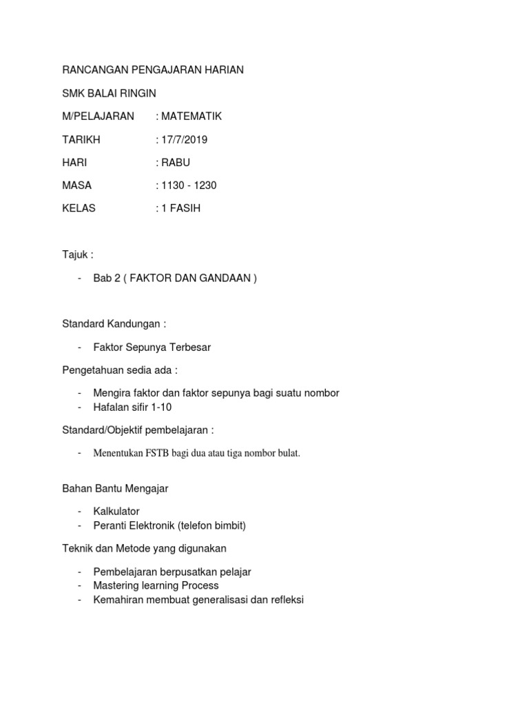 Contoh Rancangan Pengajaran Harian Kssm Tingkatan 2 Ringkas Pdf